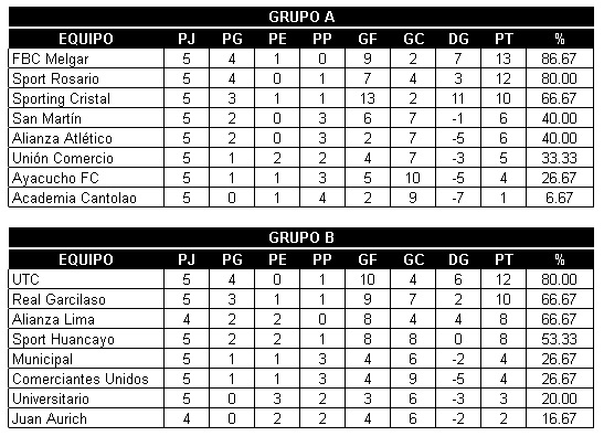 El Melgar de Arequipa es el líder del grupo A con 13 unidades, en el segundo lugar se ubica el Sport Rosario con 12 unidades.