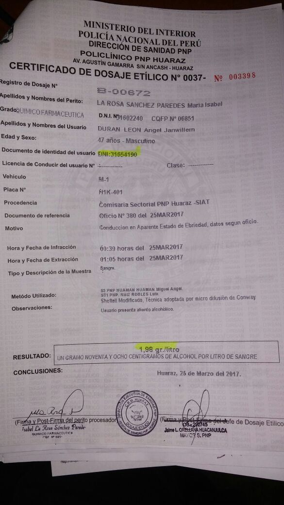 Las autoridades ordenaron el dosaje etílico, cuyo registro es el 037 otorgado por la químico farmacéutico María Isabel Las Rosa Sánchez Paredes de la Dirección de Sanidad PNP – Policlínico Huaraz, informando que tenía 1.98 gramos de alcohol. Esta cantidad se encuentra por encima de lo permisible.
