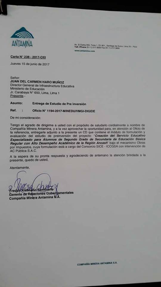 Así mismo, en compañía del alcalde de Cátac, José Maguiña Ortiz, el Ing. Carlos Flores Acevedo, representante de la compañía Minera Antamina, en la reunión con el director general de infraestructura educativa del ministerio de educación, ing. Juan del Carmen Haro, con el propósito de generar compromisos para la construcción del Colegio de Alto Rendimiento COAR – Cátac.