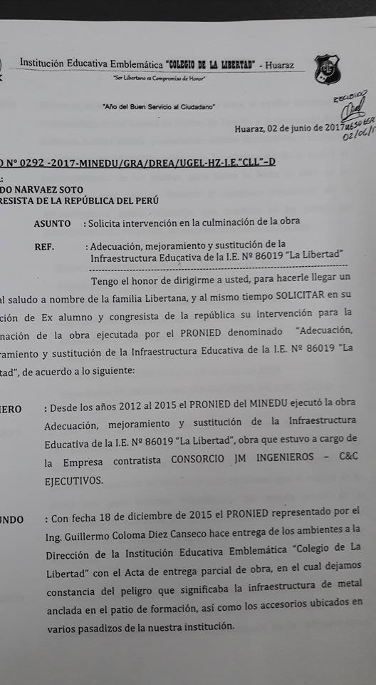 Consiguiendo resultados positivos, debido a que los funcionarios del PRONIED aseguraron que el expediente final del proyecto estará listo para su licitación en noviembre de este año. De esta forma, el parlamentario reafirma así su compromiso de trabajo y más aún con la educación ancashina.