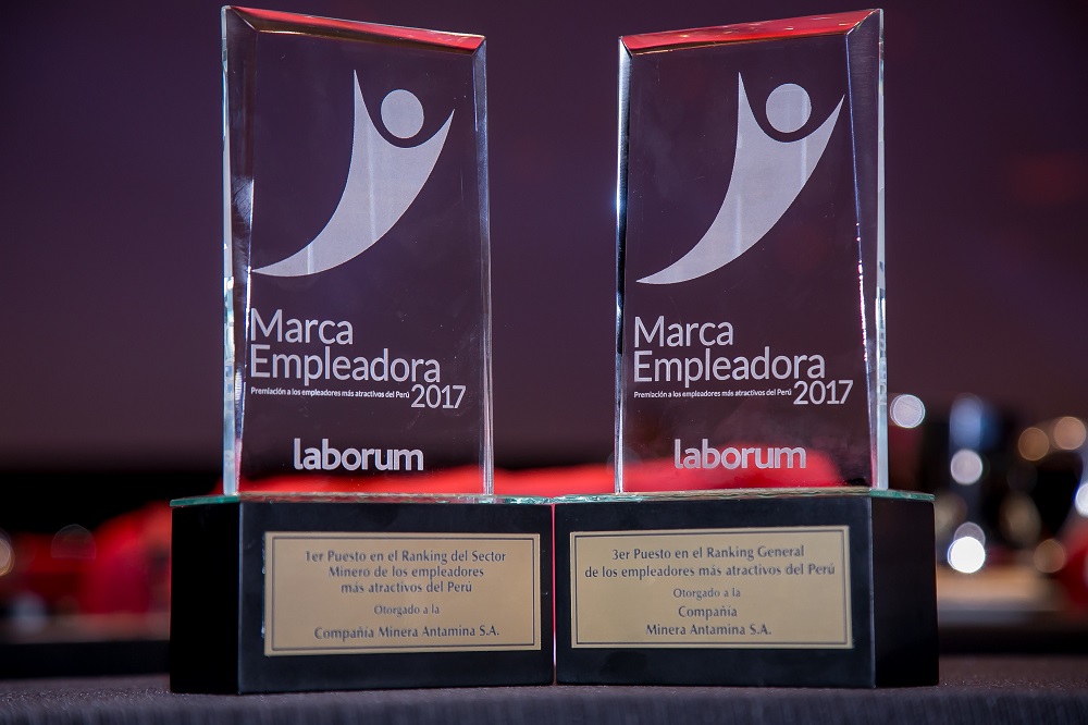 Antamina, por quinto año consecutivo, se ubica como la mejor empresa en el sector minero y además ha sido elegida como la tercera empresa más atractiva para trabajar en el Perú, según la encuesta Marca Empleadora 2017 elaborada por Laborum y Apoyo Comunicaciones. La encuesta identifica cuáles son las empresas y los rubros que los peruanos consideran los más atractivos para trabajar. Es importante destacar que es la encuesta más grande que se ha realizado en el Perú hasta la fecha al contar con la participación aproximada de 13 mil personas.