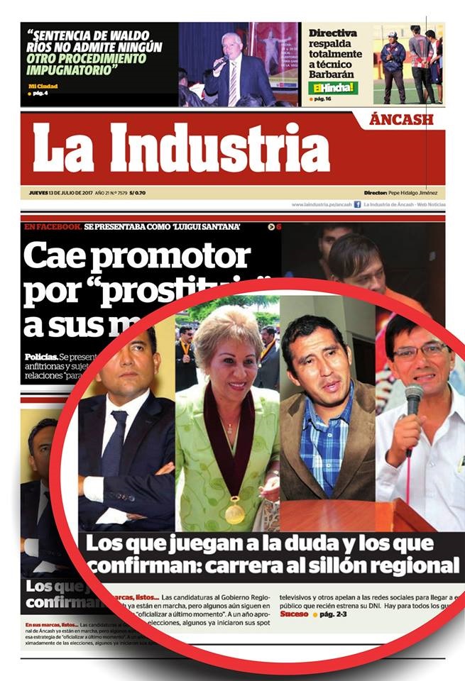 Recientemente en el diario La Industria de Chimbote apareció un revelador reportaje sobre los posibles candidatos al gobierno regional de Ancash donde aparecen con muchas posibilidades los actuales alcaldes del Santa, Victoria Espinoza y de Nuevo Chimbote, Valentín Fernández, pero también técnicos calificados como Juan Carlos Morillo, de Somos Perú; Luis Haro Ames de Hora Cero y Luis Luna Villarreal.