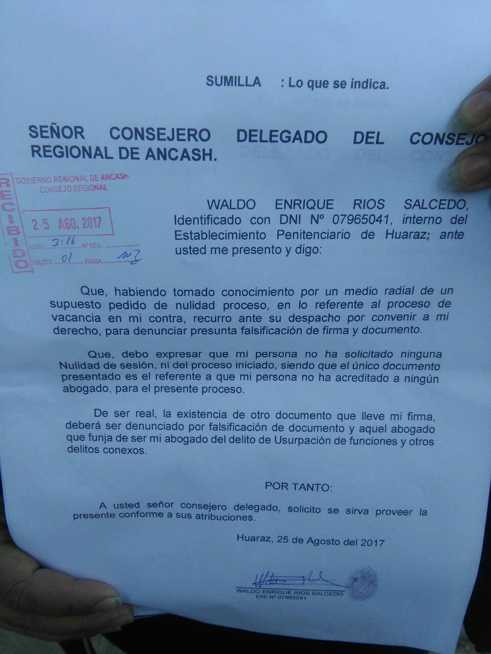 En el segundo, en cambio, Ríos advierte que “se informó por medios radiales que se trataría su vacancia y que habría un recurso de un abogado que él no autorizaba”.