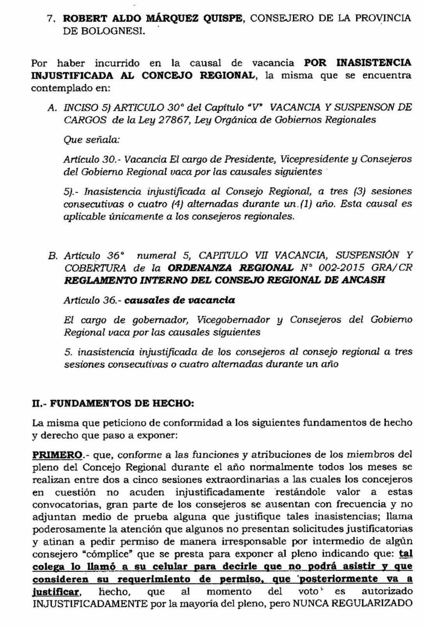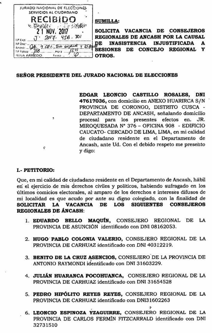 «Que, en mi calidad de ciudadano residente en el Departamento de Áncash, hábil en el ejercicio de mis derechos civiles y políticos (…) es que acudo por ante su digno colegiado, con la finalidad de SOLICITAR LA VACANCIA DE LOS SIGUIENTES CONSEJEROS REGIONALES DE ÁNCASH: