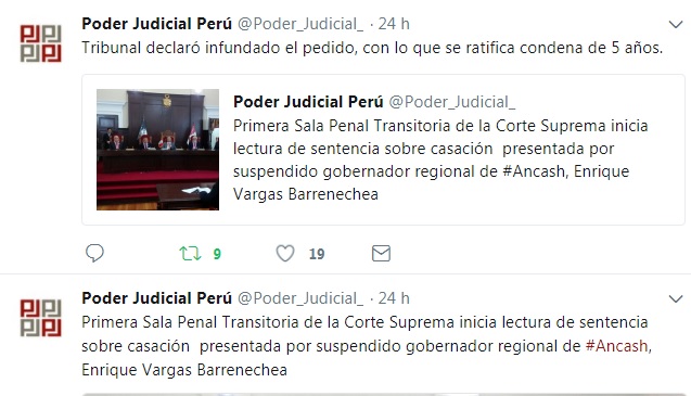 La audiencia de lectura de sentencia que originalmente fue programada para las 9.30 de la mañana recién se cumplió a partir de las 13 horas de ayer, y mediante la cuenta Twitter el Poder Judicial anunció el fallo.