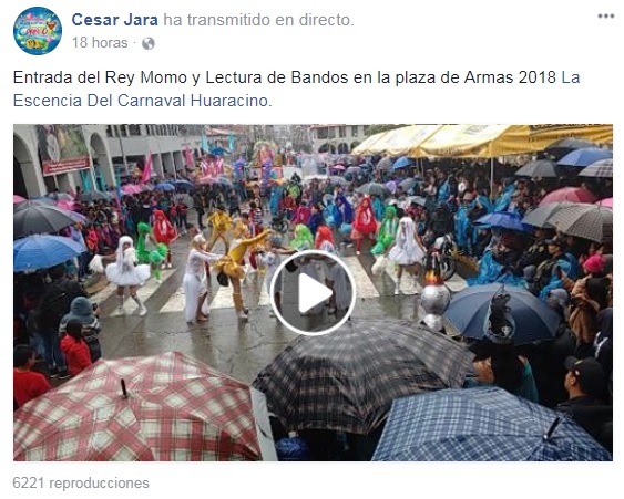 El equipo de transmisiones en vivo de Ancash Noticias, vía Faceebook, nuevamente batió ayer el récord de sintonía en la transmisión de Carnaval en Vivo (Entrada del Ño Carnavalón 2018) en Huaraz.  Fue visto por 122 mil 052 personas, con 17,360 reproducciones de vídeo; frente a Huaraz informa con 9,036 y César Jara y Gold Tv con 6,193 reproducciones.