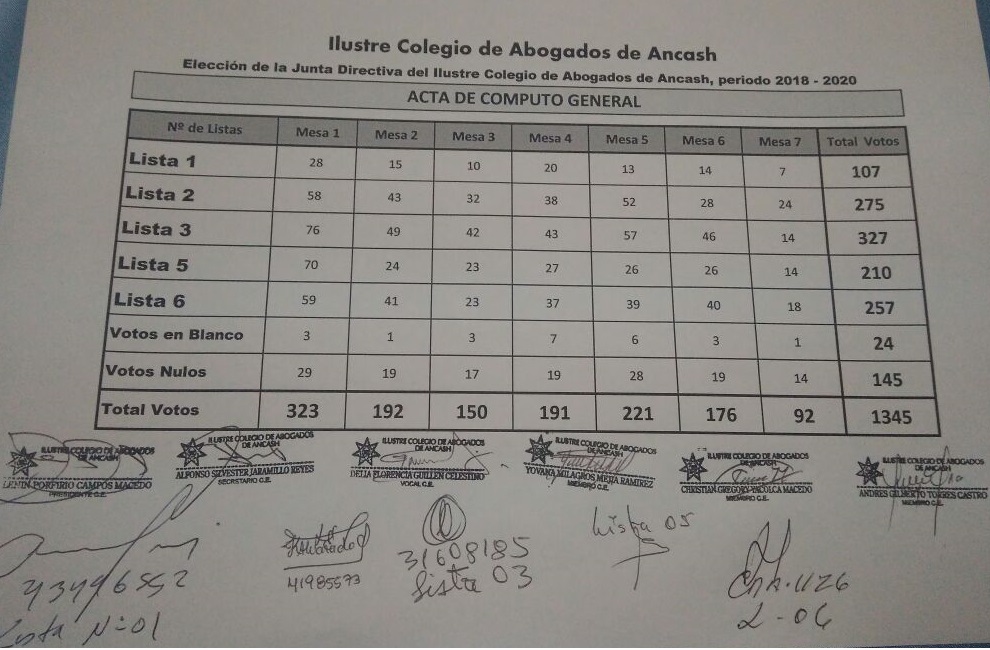 Los candidatos de las listas N° 3 “Integración Gremial” y N° 2 “Decencia, Probidad y Democracia” encabezados por los abogados Ursula Aniceto Norabuena y Stward Adair Hidalgo García pasaron hoy a la segunda vuelta en las elecciones que realizó el Colegio de Abogados de Ancash.  Ambas listas fueron las primeras pero no alcanzaron el 50% + 1 que prevén los estatutos para alzarse con el triunfo.