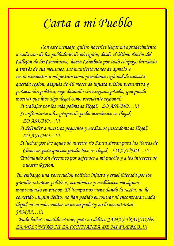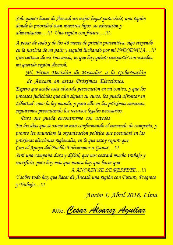 En la carta publicada en el Facebook de César Álvarez se lee que tomó la decisión de postular en las elecciones regionales del presente año.  “Espero que acabe esta absurda persecución en mi contra y que los procesos judiciales que aún siguen su curso, los pueda afrontar en libertad como la ley manda y para ello en las próximas semanas seguiremos presentando los recursos legales necesarios”.
