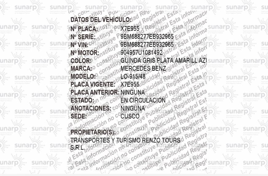 La unidad vehicular siniestrada fue identificada con placa X7E-955 de propiedad de Transporte y Turismo Renzo Tours S.R.L.