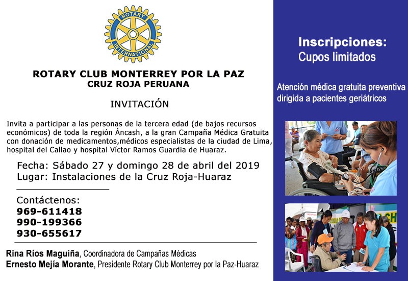 Con la participación de médicos de los hospitales Daniel Alcides Carrión y el hospital Ramos Guardia de Huaraz, hoy sábado y mañana domingo se realiza la atención médica integral a todas las personas de la tercera edad gracias a la organización del Rotary Club Monterrey.