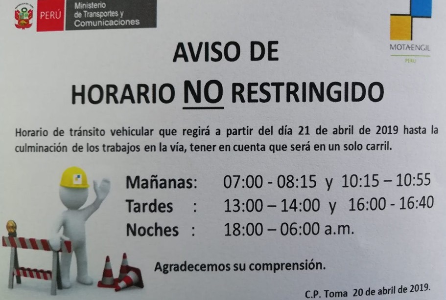 Las restricciones del trànsito vehicular por los trabajos de rehabilitación de la vía Caraz-Huaraz, por el sector Bajada de Quinuacocha-Monterrey se darán solo hasta el viernes 10 de los corrientes según informó la Defensoría del Pueblo, luego de recabar información de parte de la emprea Mota Engil, que tiene a su cargo las mencionadas obras.