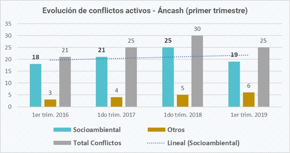 Según el último informe, Áncash es la región que ha reportado el mayor número de conflictos sociales (25), de las cuales el 76% representa al tipo de conflictos socio ambientales (19), entre activos y latentes. Lo preocupante de este último reporte es el ligero incremento de conflictos socioambientales para el primer trimestre, respecto al 2016, y la tendencia a incrementarse en los próximos meses de este año, todos alrededor de proyectos mineros con mayor importancia, como son Antamina y Barrick, este último en proceso de cierre social.