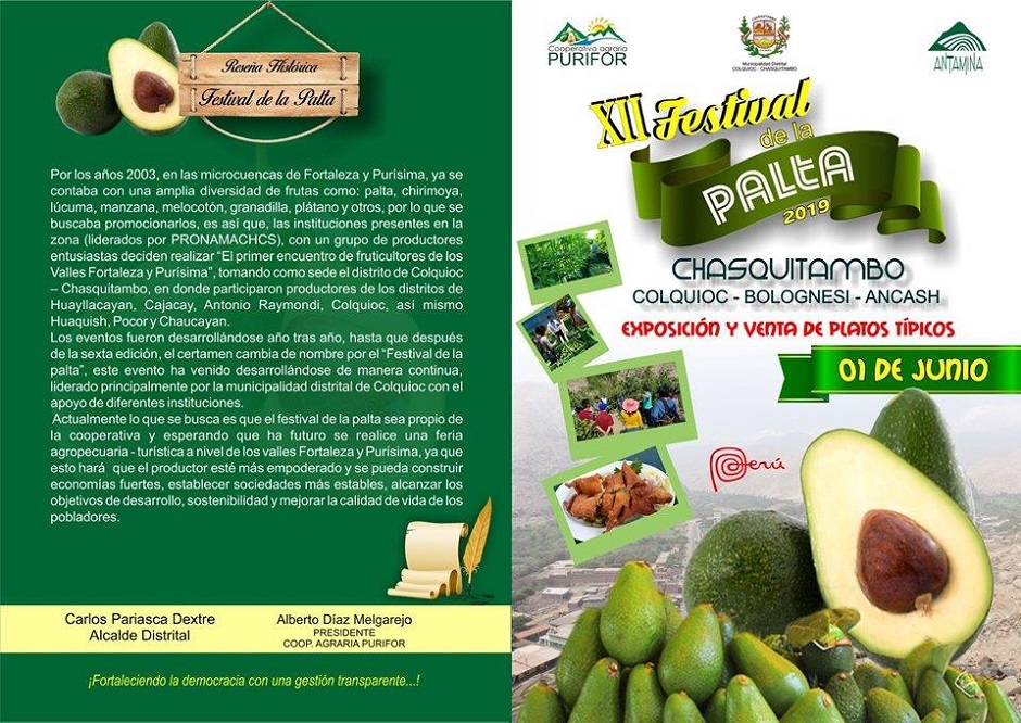 Por César Palma Huerta.- La cooperativa agraria PURIFOR en coordinación con la Municipalidad Distrital de Colquioc Chasquitambo y los productores locales del valle fortaleza y purísima reinician con gran expectativa la XII expo feria de la palta 2019 con la exposición y venta de platos típicos que se llevará a cabo hoy 1 de junio en Chasquitambo, provincia de Bolognesi.