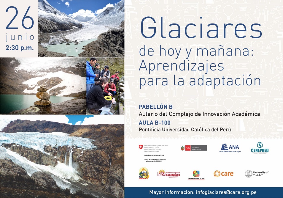 El proyecto Glaciares+ se desarrolló en el marco de la cooperación entre Perú y Suiza con la participación del Ministerio del Ambiente, la Autoridad Nacional del Agua, el Centro Nacional de Estimación y Prevención de Riesgos, los Gobiernos Regionales de Ancash, Cusco y Lima, y facilitado por el consorcio CARE Perú y la Universidad de Zurich.