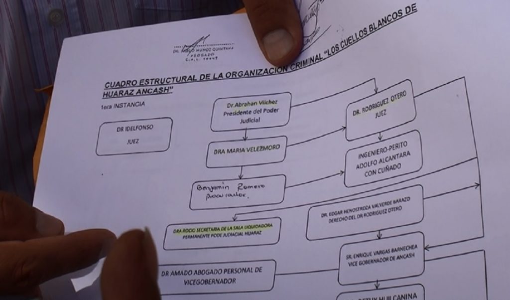 Mostrando un diagrama, graficó la citada organización habría estado encabezado por el ex presidente de la Corte Superior Abraham Vílchez Castro y los magistrados Ildefonso, Rodriguez Otero, María Velezmoro, un empresario, el ex procurador Anticorrupción Benjamín Romero y el perito Adolfo Alcántara y el ex gobernador regional Enrique Vargas Barrenechea.