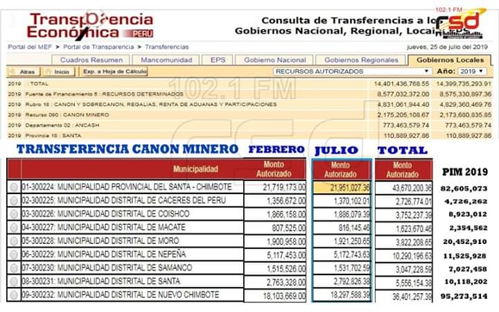 El Gobierno Regional de Áncash ha recibido 155.2 millones de soles en este julio, dinero que se suma a los 102.5 millones que le fueron transferidos en febrero de este año, haciendo un total de 257.8 millones de soles por concepto de canon minero.
