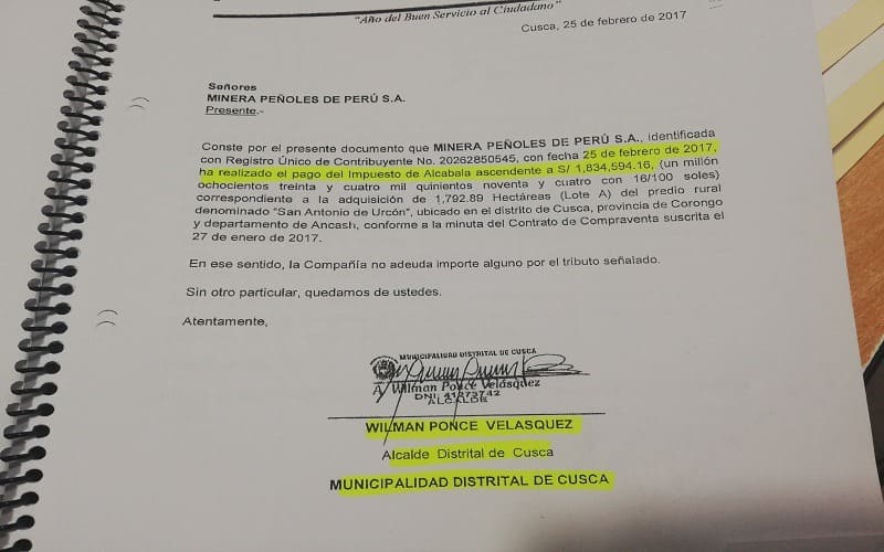 La empresa Minera Peñoles de Perú S.A. pagó 1 millón 834 mil soles de impuesto de alcabala a su municipio por la compra de dicho terreno, pero este dinero tampoco figura en la municipalidad.