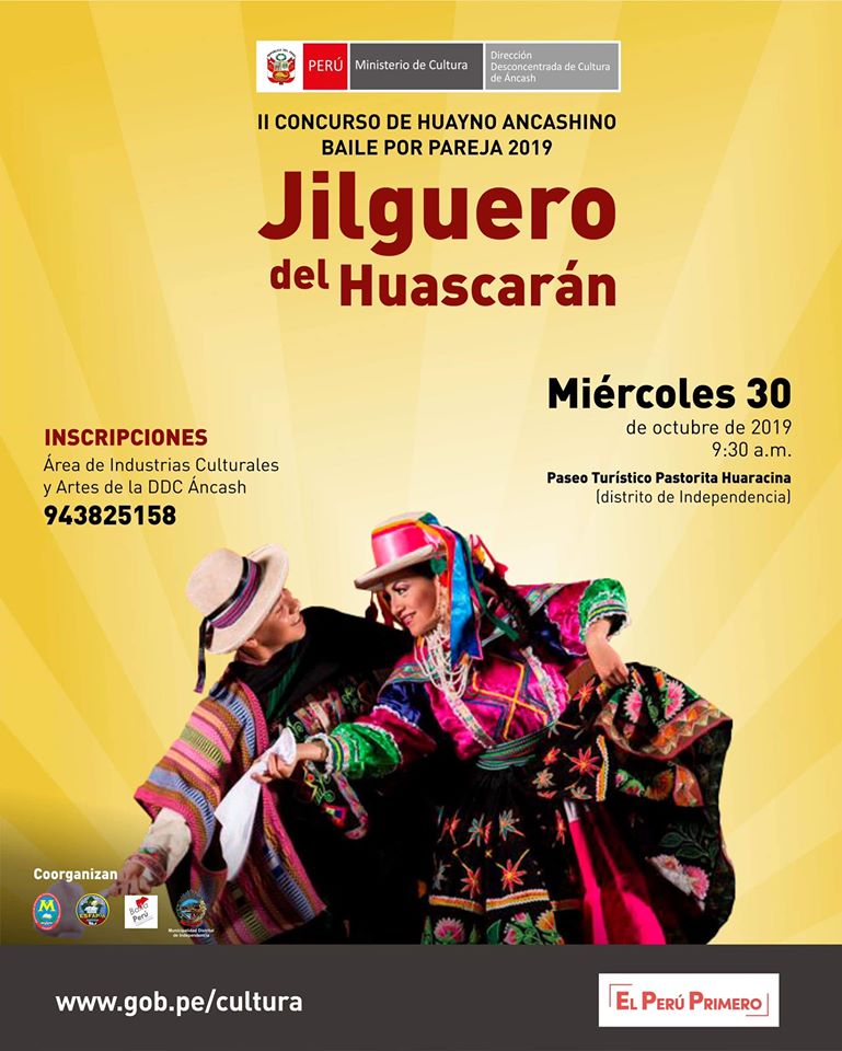 La Municipalidad Distrital de Independencia, en coordinación con la Dirección Desconcentrada de Cultura de Ancash (DDC) , realizarán el II Concurso de Huayno Ancashino Baile por Pareja 2019 «Jilguero del Huascarán». El certamen tendrá 2 categorías y se desarrollará el 30 de octubre, a las 9:30 a.m. en el Paseo Turístico Pastorita Huaracina.