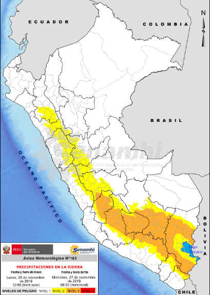En la sierra norte se presentarán acumulados por encima de los 10 mm/día; mientras que en la sierra centro y sur se esperan valores superiores a los 15 mm/día durante los días lunes 25 y martes 26 de noviembre.