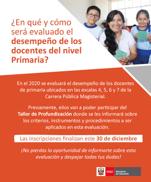 Los docentes de Áncash del nivel Primaria de las escalas 4, 5, 6, y 7 que serán evaluados en el primer tramo de la Evaluación del Desempeño Docente y se inscriban a los Talleres de Profundización, podrán conocer en qué y cómo serán evaluados entre el 20 de enero y el 28 de febrero de 2020 en las sedes que serán publicadas el 2 de enero en la web www.minedu.gob.pe/evaluaciondocente