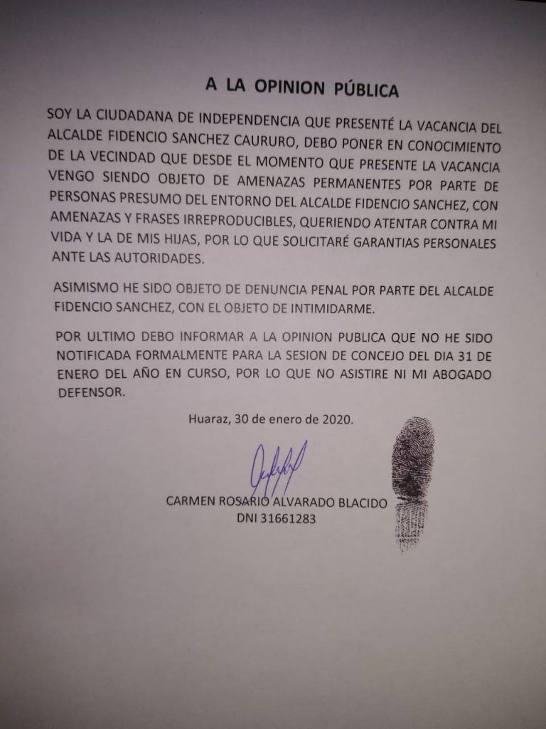 Mientras tanto la ciudadana Carmen Gonzales a través de las redes sociales hizo público una carta abierta donde denunció ser víctima de un hostigamiento y persecución e incluso de una denuncia penal por el solo hecho de haber presentado el recurso de vacancia, y asegura que no fue notificada formalmente.