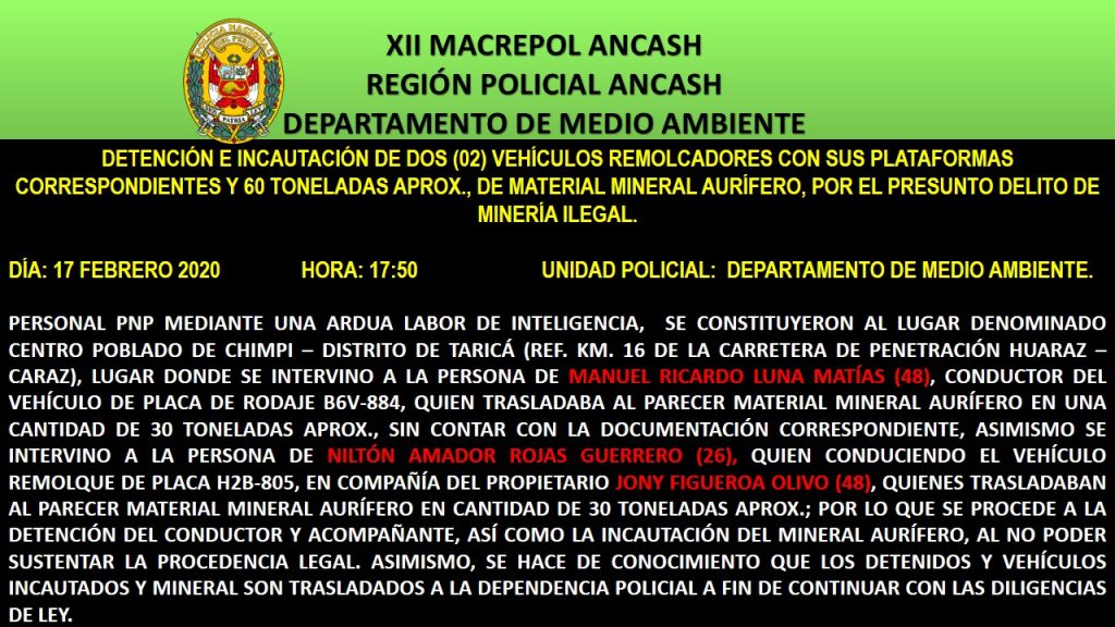 A través de un comunicado de prensa, el Departamento de Medio Ambiente de la Región Policial de Áncash, informó que intervinieron a tres personas, implicadas en la presunta comisión del delito de Minería Ilegal. La intervención, según detallaron, se realizó en el centro poblado de Chimpe, distrito de Taricá (Huaraz).