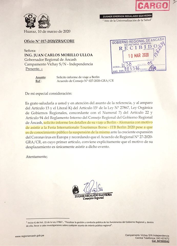 Zugner Regalado Saavedra, consejero regional por la provincia de Huaraz, lamentó, que el gobernador regional de Áncash, Juan Carlos Morillo Ulloa, haya viajado a Berlín, pese a que “la Feria Internacional de Turismo en Berlín”, fue cancelada por la alarma del Coronavirus.
