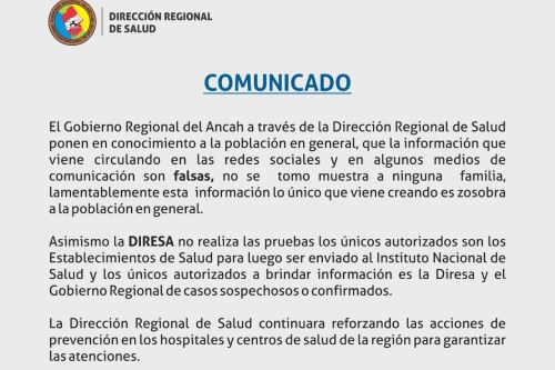 La dirección regional de Salud de Ancash a través de un comunicado desmintió categóricamente la existencia de una familia con sospecha de portar coronavirus y que haya sido internado a alguna clínica particular.  Esta versión circuló profusamente a través de las redes sociales y algunos medios de comunicación comenzaron a especular.