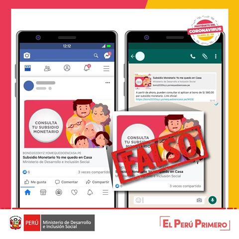 “Hemos estado detectando muchos links (enlaces web) vía redes sociales y todos son falsos. Ni el Midis ni el Ministerio de Economía y Finanzas (MEF) ni el Gobierno peruano han emitido alguno de estos mensajes. Cuando lo hagamos oficialmente, vamos a comunicar a la prensa y a pedir que, por favor, nos ayuden a difundir. No se dejen sorprender”, advirtió.