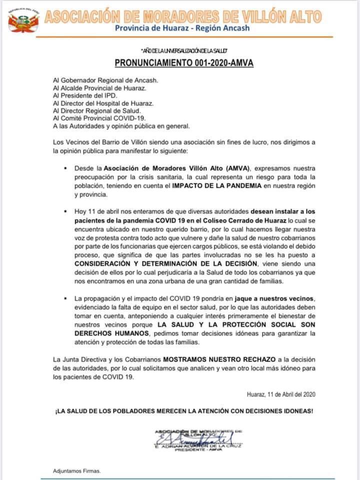 En su comunicado indican que, hoy 11 de abril, se enteraron que diversas autoridades desean instalar a los pacientes de la pandemia covid-19 en el coliseo cerrado de Huaraz, el cual se encuentra ubicado en dicho barrio, por lo cual hacen llegar su voz de protesta contra todo acto que vulnere y dañe la salud de sus vecinos por parte de los autoridades locales.
