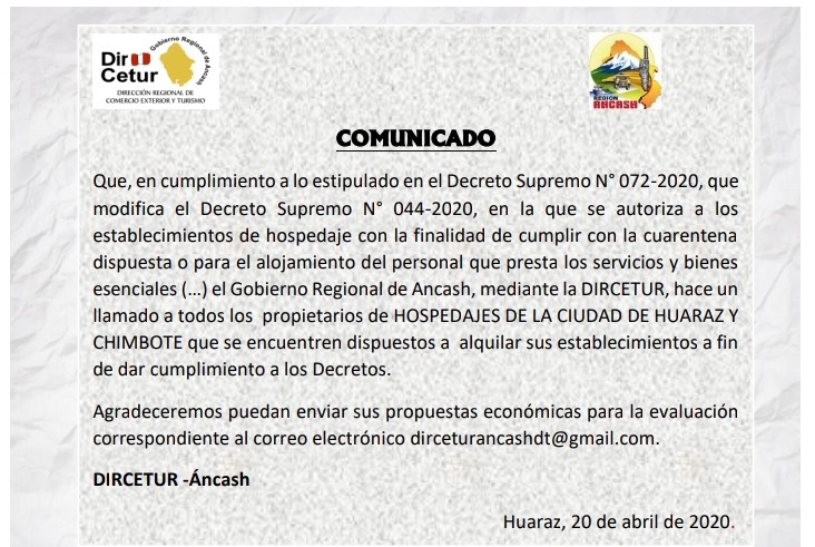 Asimismo la titular de la Dircetur Áncash, hace un llamado a los propiertarios de hospedajes de la ciudad de Huaraz y Chimbote que se encuentren dispuestos a alquilar sus establecimiento a fin de dar cumplimientos a los decretos a enviar sus propuestas económicas al correo electrónico dirceturancashdt@gmail.com.