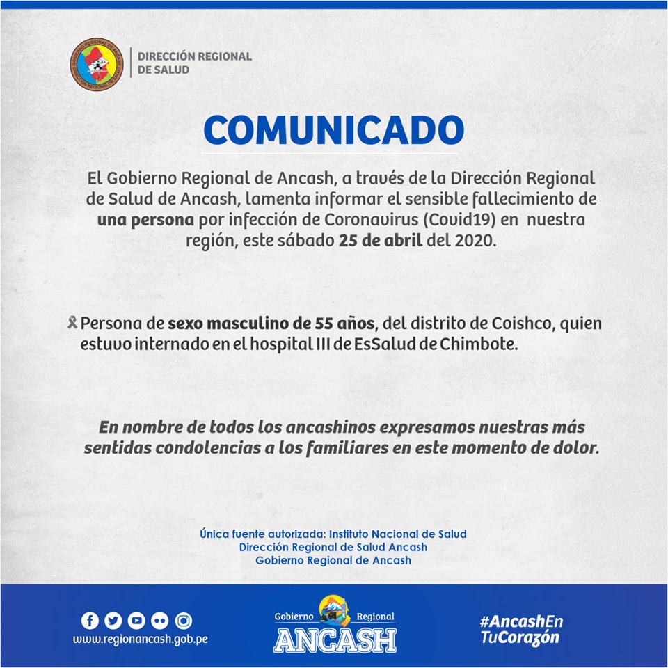 Este nuevo fallecimiento corresponden a un paciente de 55 años de edad, quienes no resistió a la enfermedad causada por el virus. El paciente ancashino era natural del distrito de Coishco, provincia del Santa (Áncash).