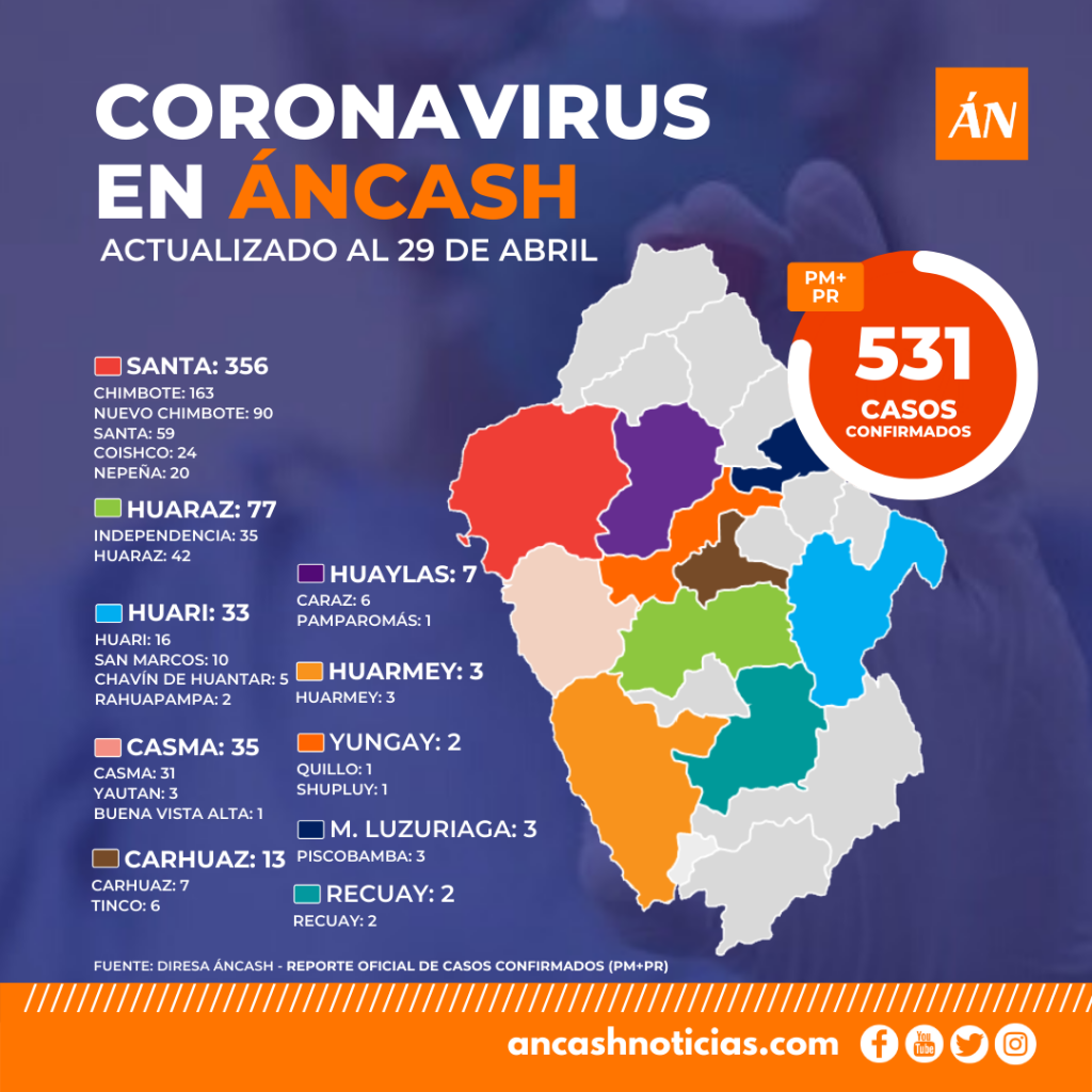 A 531 casos se incrementó la cifra de pacientes contagiados por el nuevo coronavirus (Covid-19) en la región Áncash, según informó la Dirección Regional de Salud (DIRESA) este miércoles 29 de abril.
