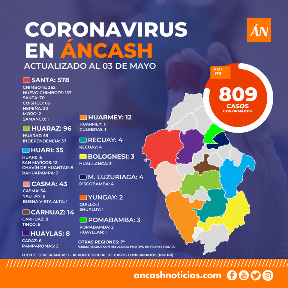 La provincia del Santa ocupa el primer lugar con 578 casos, habiéndose además extendido nuevos casos en los distritos de Moro y Samanco; Huaraz, está en el segundo lugar de casos con 96 concentrándose únicamente en los distritos cercado de Huaraz e Independencia más no en los demás distritos.