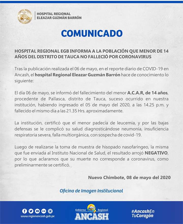 El hospital Eleazar Guzmán Barron, emitió comunicado, dando cuenta que el adolescente de iniciales A.C.A.R, de 14 años, procedente del distrito de Tauca, provincia de Pallasca, no murió a causa del Covid-19, como se informó el pasado 06 de mayo.