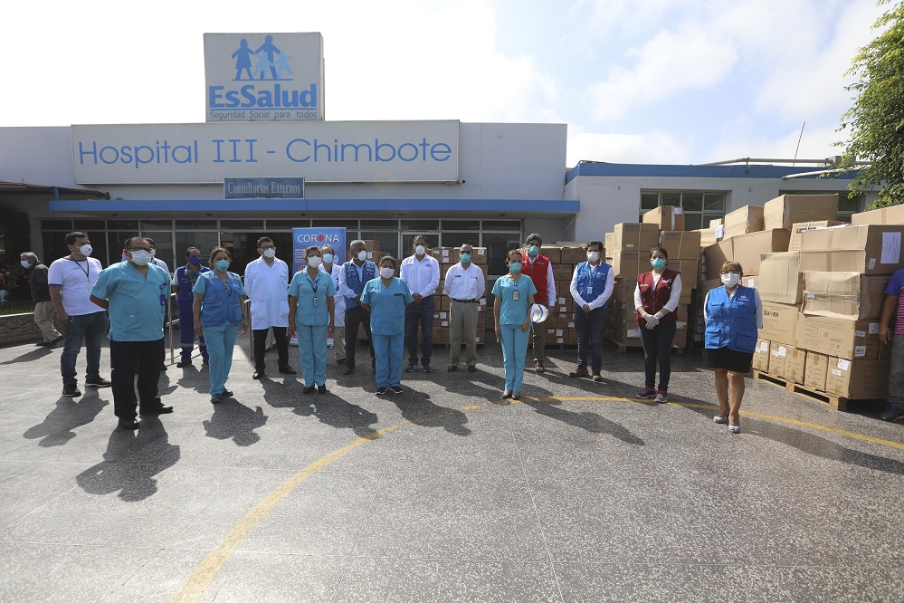 Los materiales entregados hoy en Chimbote comprenden mamelucos, guantes quirúrgicos, mascarillas, protectores oculares, mandiles y chalecos descartables, protectores faciales, desinfectantes para superficies y clorhexidina gluconato.