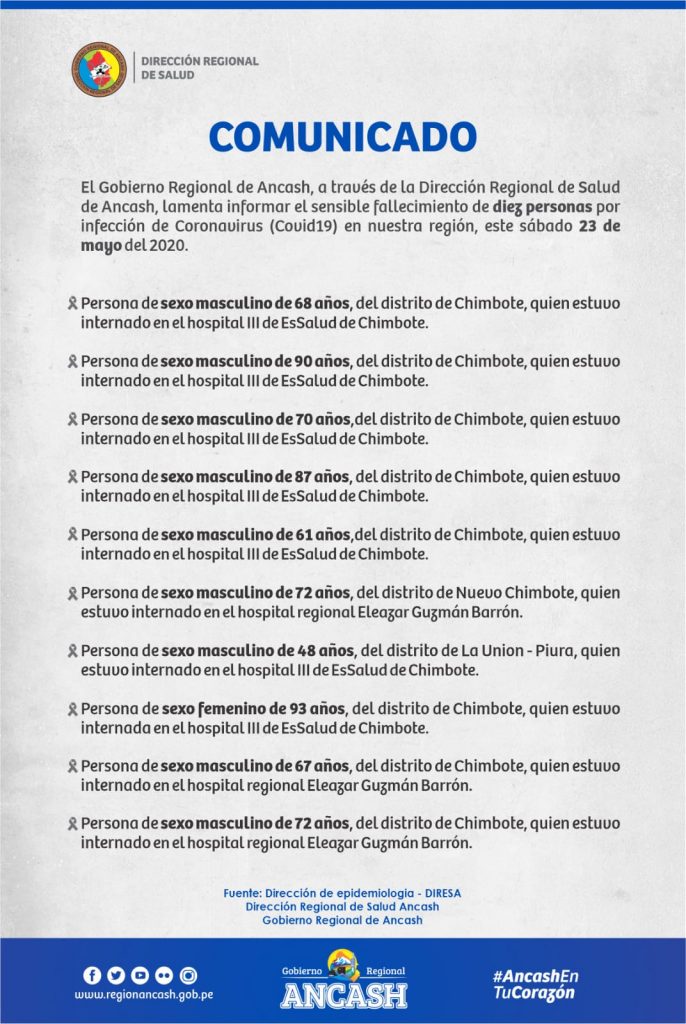 Se reporta también 10 fallecidos hoy, todos ellos en la zona costa.