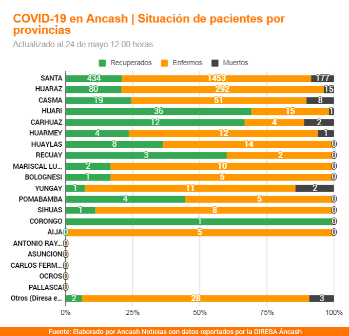 Por otro lado, la Diresa Áncash también informó que el mayor número de pacientes recuperados se registran en la provincia ancashina del Santa con 434 casos que fueron dados de alta.