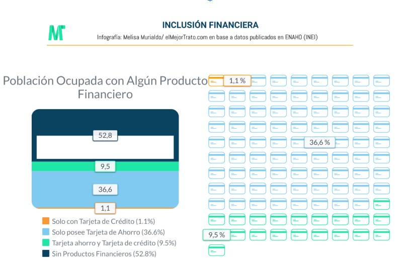 De acuerdo a últimos datos proporcionados por el INEI, un 47% de los adultos son clientes de algún banco o financiera (aunque no necesariamente lo utilice). El resto no es titular de ningún producto financiero.