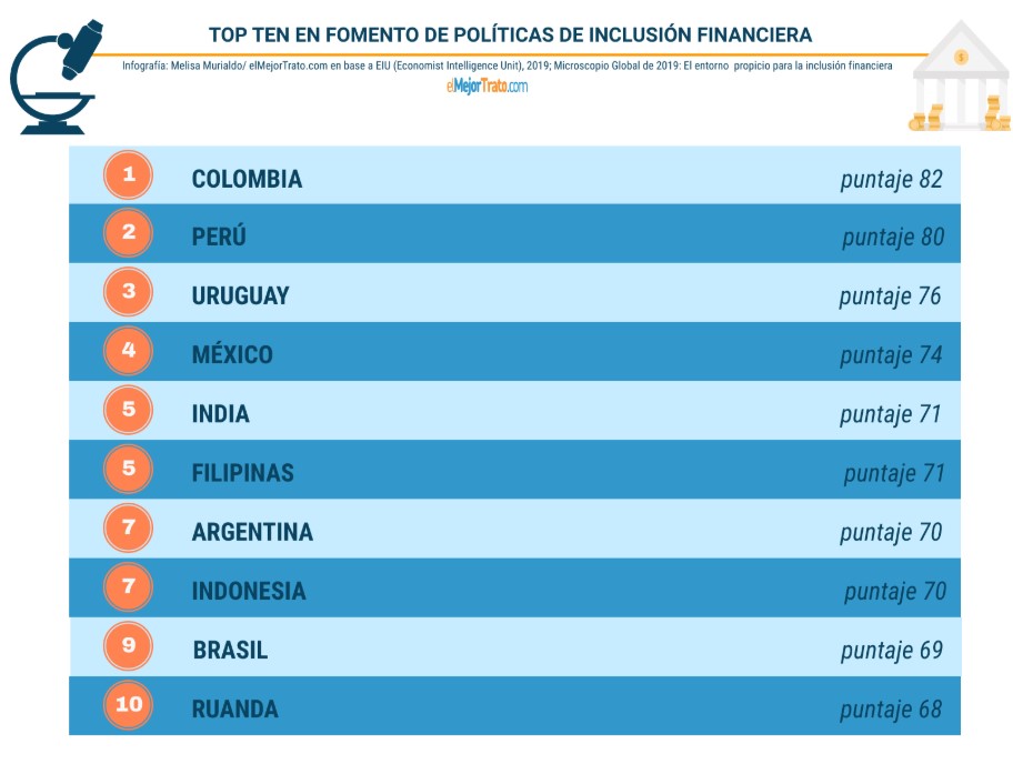 Colombia, Perú, Uruguay y México encabezan la clasificación global de entorno propicio (Anexo I) para la inclusión financiera según The Economist Intelligence Unit.