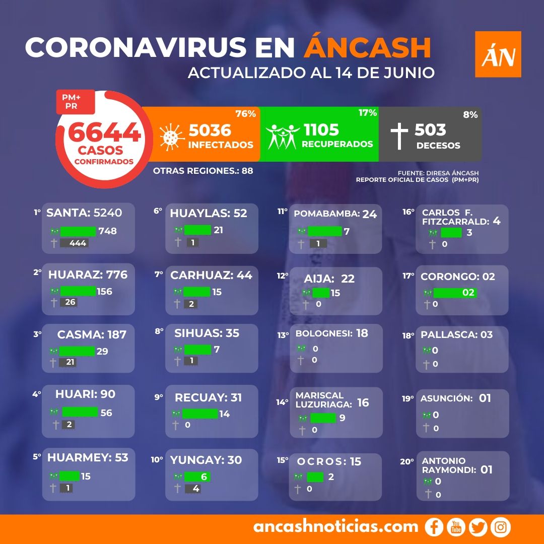Asimismo, en la lista de provincias con pacientes recuperados le siguen: Recuay (14), Mariscal Luzuriaga (9),  Sihuas (7), Pomabamba (7), Yungay (6), Carlos Fermín Fitzcarrald (3), Ocros (2)  y Corongo (2).