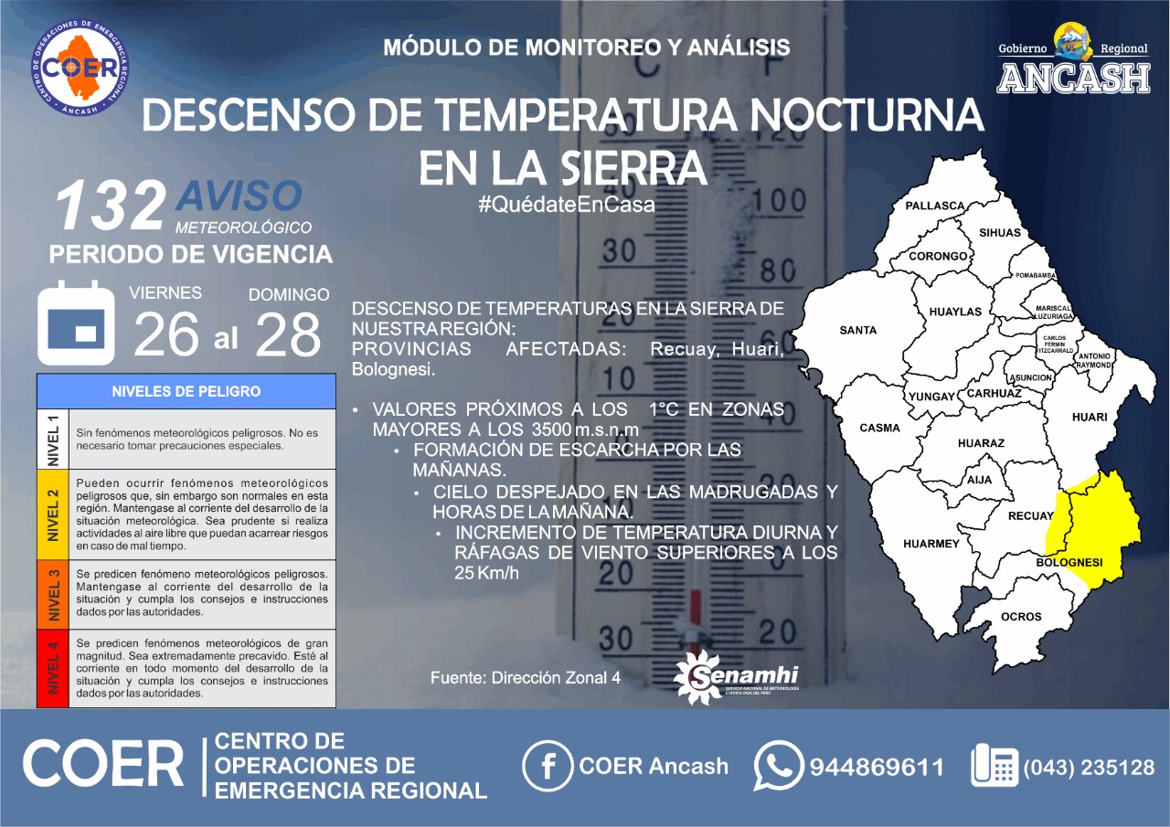 Se presentará descenso de temperatura en una parte de la zona sierra de Áncash, en las provincias de Huari, Bolognesi y Recuay, con valores próximos a  1° centígrado  de temperatura en zonas superiores a 3500 metros sobre el nivel del mar.