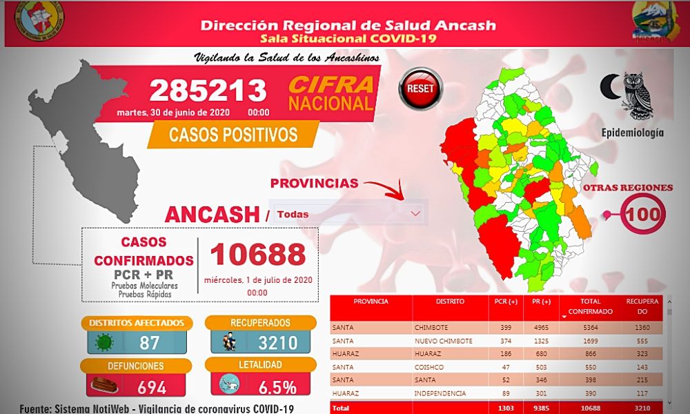Según el reporte de la Dirección Regional de Salud de Ancash HOY miércoles 01 de julio, Áncash reporta 10,688 casos confirmados, según la sala situacional COVID-19 de la Dirección Regional de Salud (DIRESA) Áncash. en el día 108 del estado de emergencia.