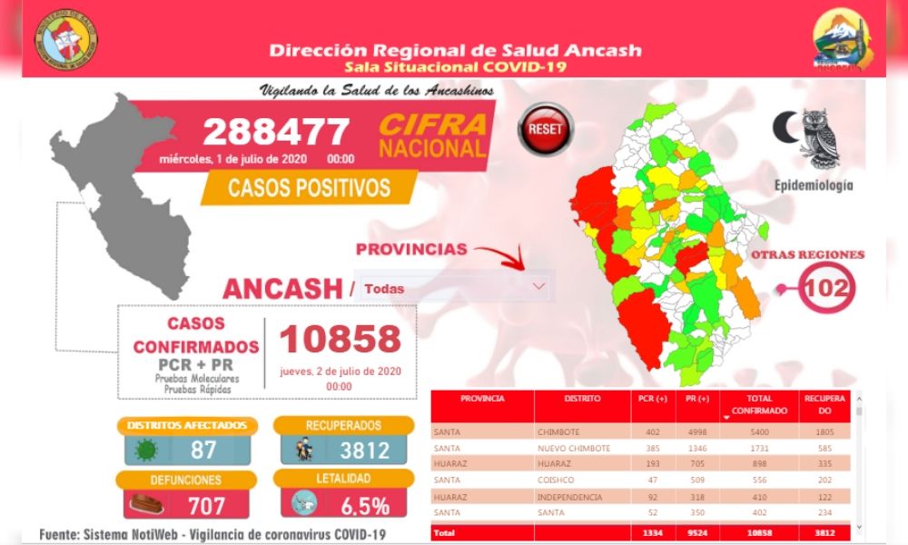 Según el reporte de la Dirección Regional de Salud de Ancash HOY jueves 02 de julio, Áncash reporta 10,858 casos confirmados, según la sala situacional COVID-19 de la Dirección Regional de Salud (DIRESA) Áncash. en el día 109 del estado de emergencia.