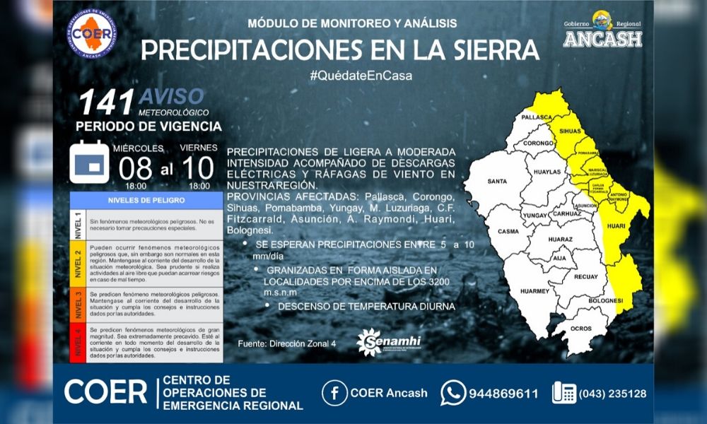 Finalmente, el COER Áncash recomienda a las autoridades locales y a la población ancashina a tomar medidas preventivas y acciones de respuesta.