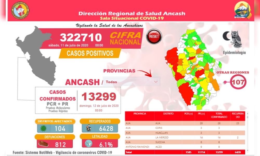 Según el reporte de la Dirección Regional de Salud de Ancash HOY domingo 12 de julio, Áncash reporta 13,299 casos confirmados, según la sala situacional COVID-19 de la Dirección Regional de Salud (DIRESA) Áncash. en el día 119 de la cuarentena en la región.