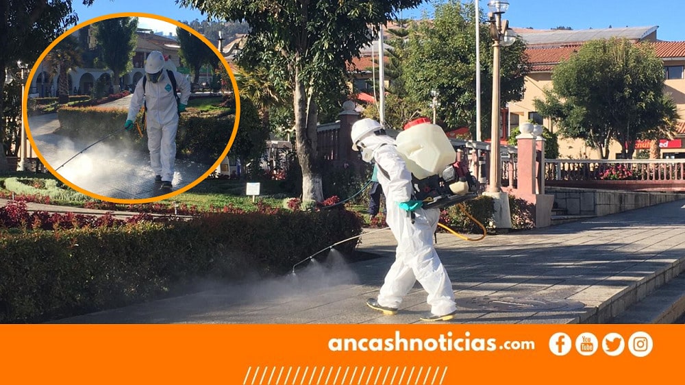 La Municipalidad Provincial de Huaraz y el Centro de Operaciones de Emergencia (COER) de Áncash realizaron trabajos de desinfección en la Plaza de Armas de la capital de la región Áncash este lunes 13 de julio, a fin de evitar la propagación del nuevo coronavirus (Covid-19).