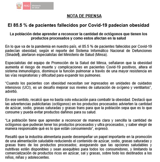 Coronavirus en Perú: El 85% de fallecidos por COVID-19 padecía de obesidad