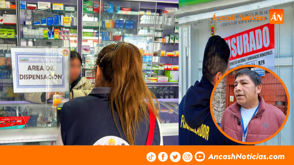 La Municipalidad Provincial de Huaraz clausuró una farmacia y sancionó a otra tras hallarse medicamentos vencidos, sin registro sanitario y de dudosa procedencia en sus instalaciones. El operativo inopinado fue realizado en coordinación con la Dirección Regional de Medicamentos (Diremid) y la Subgerencia de Sanidad y Salubridad, con el fin de proteger la salud pública ante denuncias ciudadanas.