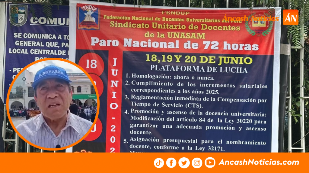 Este miércoles, los docentes de la Universidad Nacional Santiago Antúnez de Mayolo (UNASAM) se sumaron al paro nacional de 72 horas convocado por la Federación Nacional de Docentes Universitarios del Perú (FENDUP), como parte de una jornada de protesta para exigir el cumplimiento de la ley de homologación salarial, pendiente desde hace más de cuatro décadas.